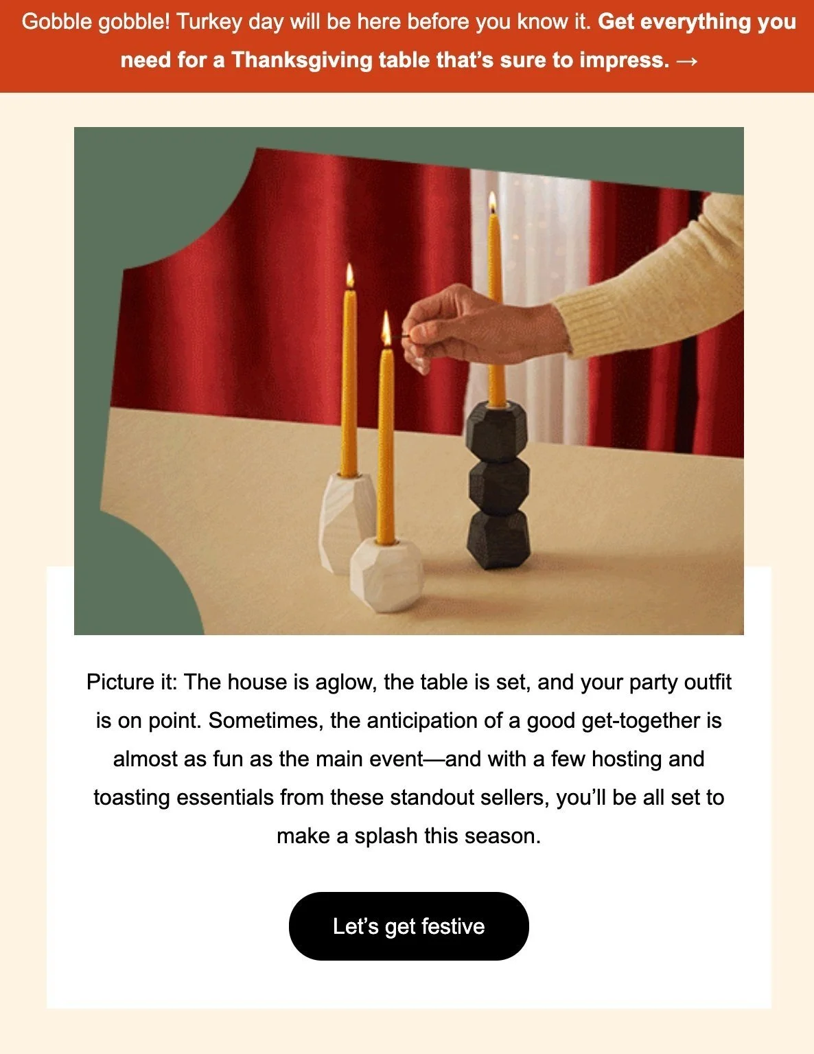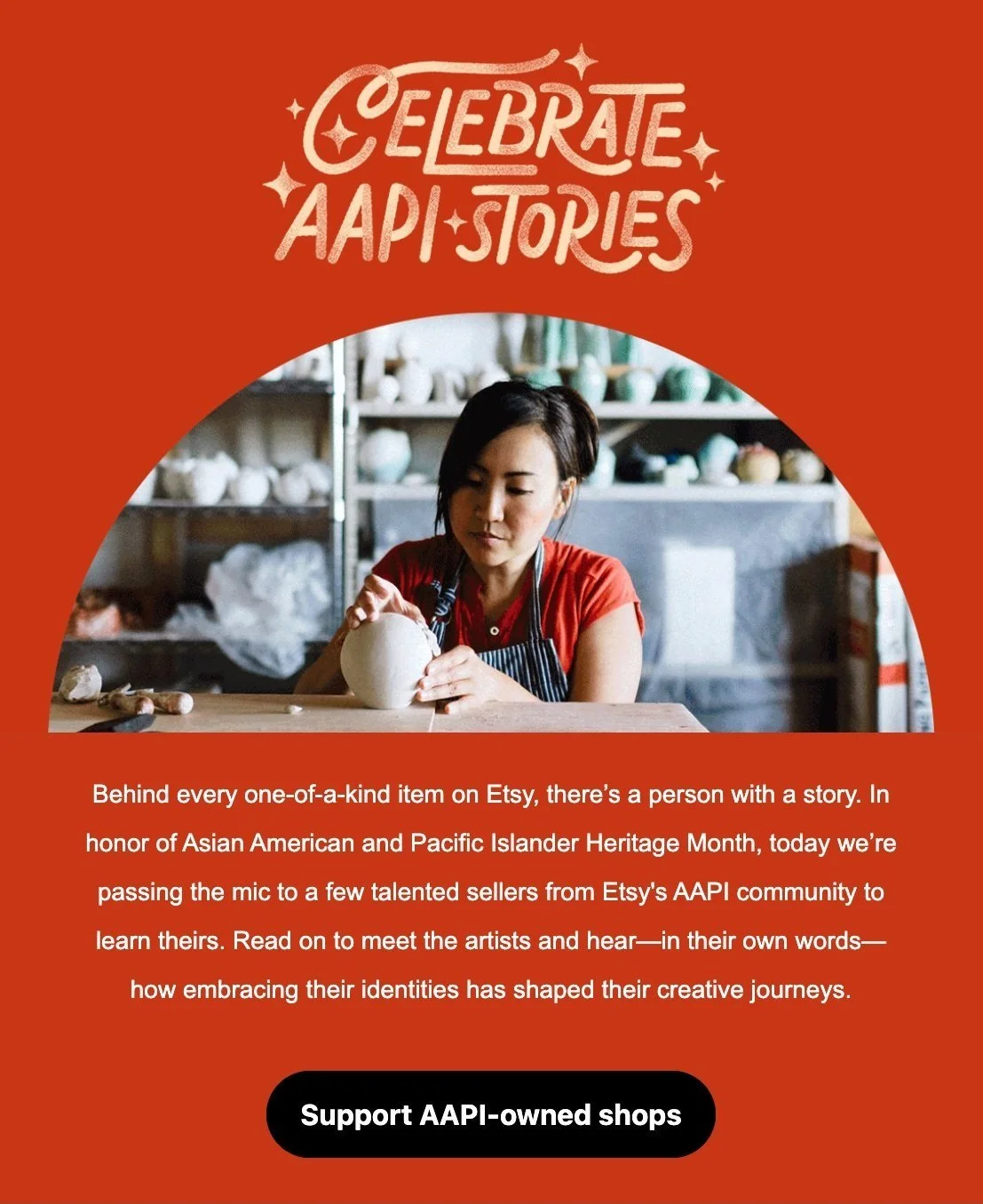 Along with producing long-form editorial pieces, at Etsy I also created complementary content for email campaigns, on-site Editors’ Picks pages, and a range of other marketing channels. In this track of work my key responsibilities included not only copywriting, but also developing impact campaign content strategy, managing an intensive seller scouting, vetting, and interviewing process, and designing integrated landing page experiences.